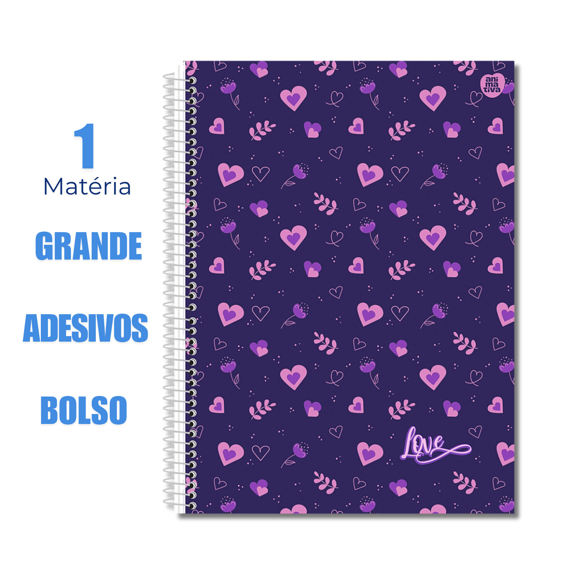 Caderno Universtário 1 Matéria Love Roxo Corações