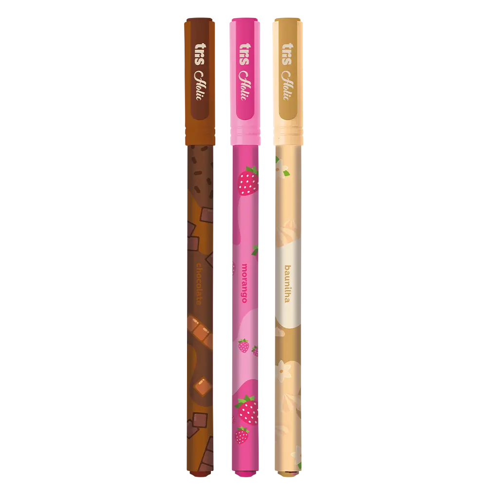 A coleção Docinho traz para as papelarias produtos inspirados nas delícias do universo da confeitaria! Donuts, balinhas, sorvetes e muito mais! É pura fofura! A caneta esferográfica Napolitano é muita doçura! Sua tinta é colorida e tem cheirinho de chocolate, morango e baunilha! Tem ponta fina, 0.7mm e escrita fluida!