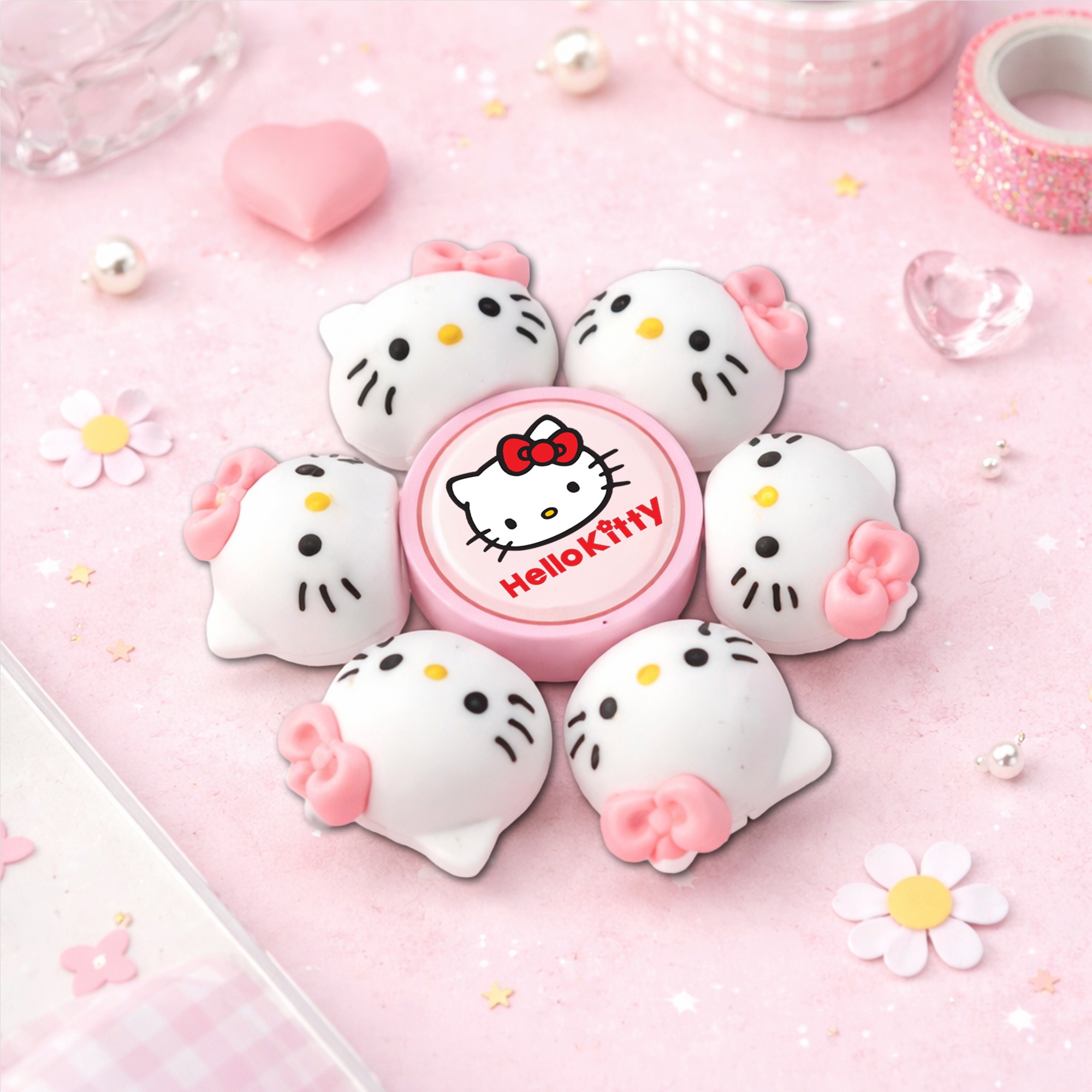 Deixe seus estudos e anotações muito mais fofos e divertidos com o kit de marca textos Hello Kitty. Com design encantador inspirado na famosa gatinha, cada marca texto possui um formato criativo que também funciona como spinner, tornando o momento de estudar mais leve e interativo.